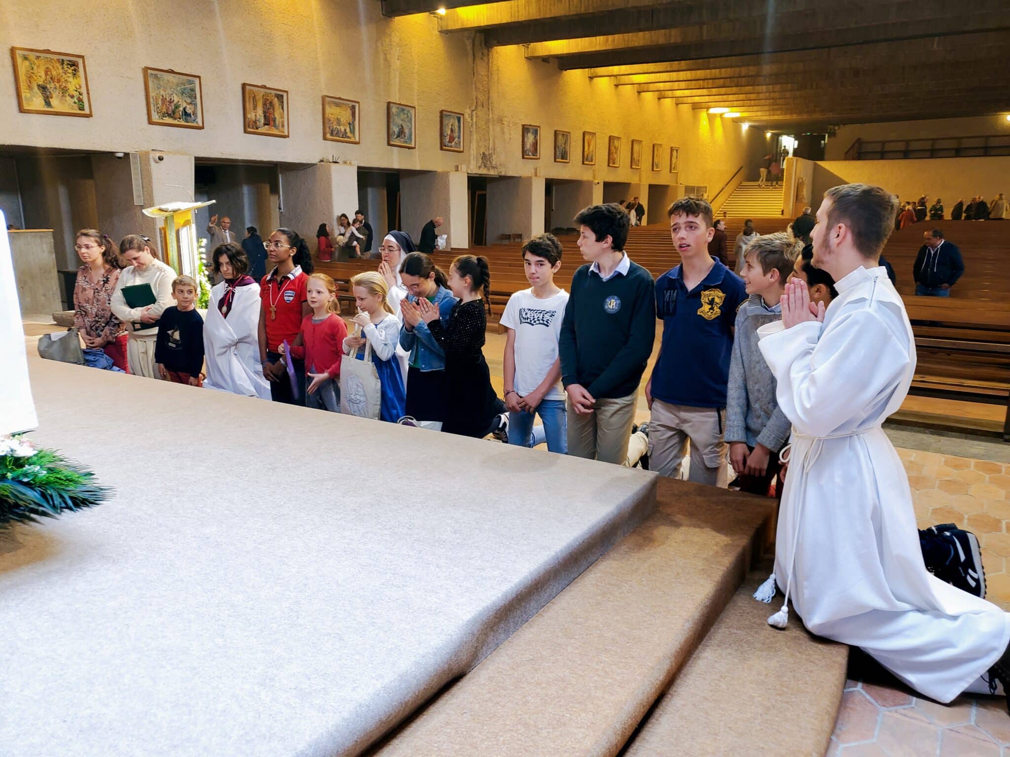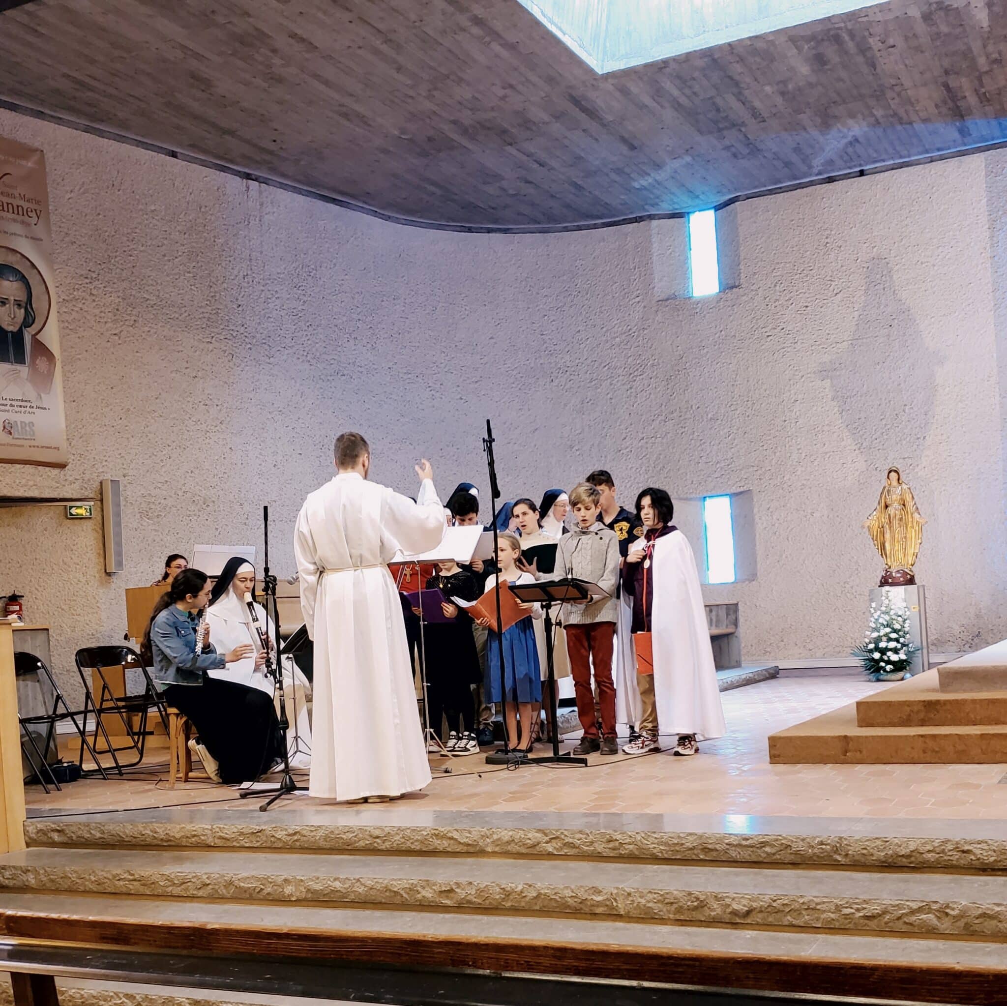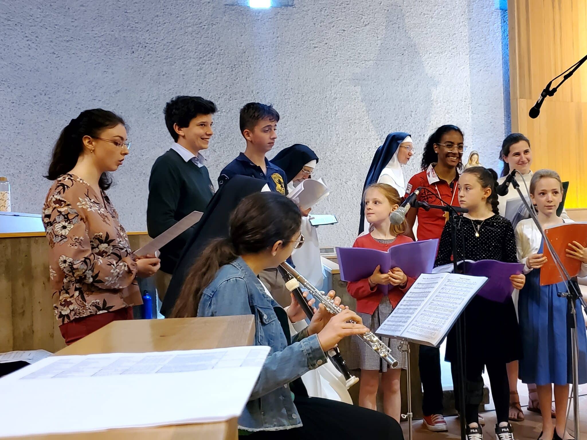 Ce dimanche 9 juin, à la messe de 11h célébrée à l’église Notre Dame de la Miséricorde, plusieurs servants de la liturgie, rejoints par 2 autres jeunes adultes et guidés, pour le chant, par un propédeute du séminaire, ont fait l’expérience de vivre la messe en entraînant l’assemblée par leur chant, en soutenant par leur instrument de musique, en proclamant une lecture ou en lisant la prière universelle.